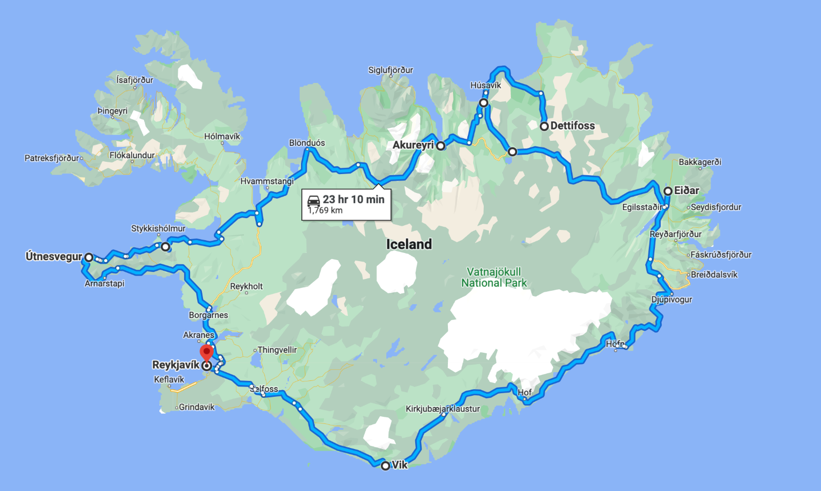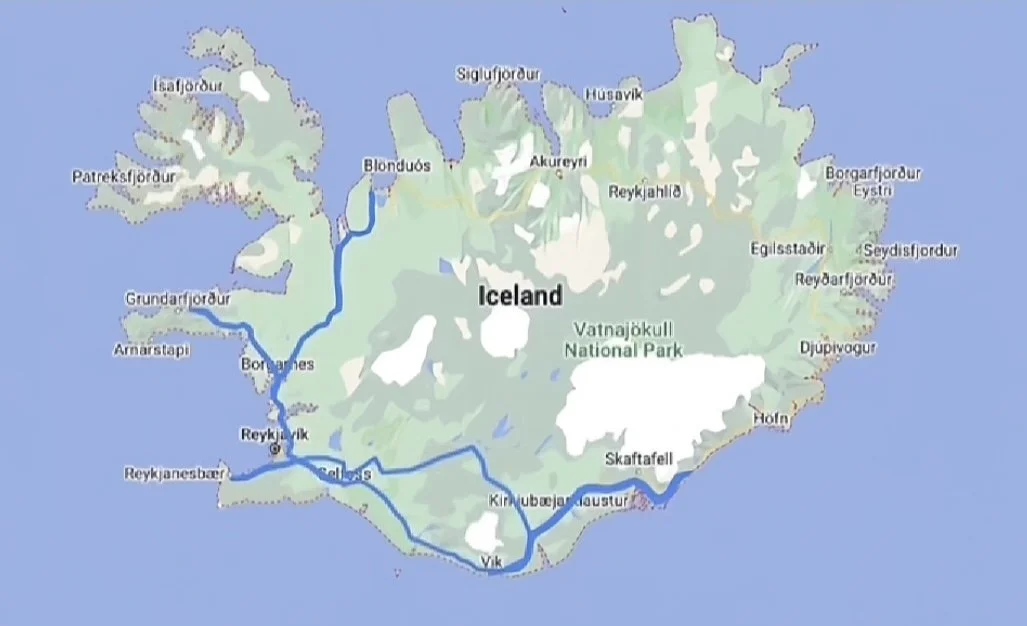 Our route began at KEF airport, where we traveled through the Golden Circle, the Central Highlands, and the South before returning to the capital. From there, we explored the western and northern routes. Our tour lasted 6.5 days, excluding the waterfalls and lakes along the northeastern part of the Ring Road. We spent two nights in the Golden Circle, two nights in the South, and two nights in the West. I recommend allowing some buffer time in each area, as heavy rainfall can sometimes disrupt travel plans.