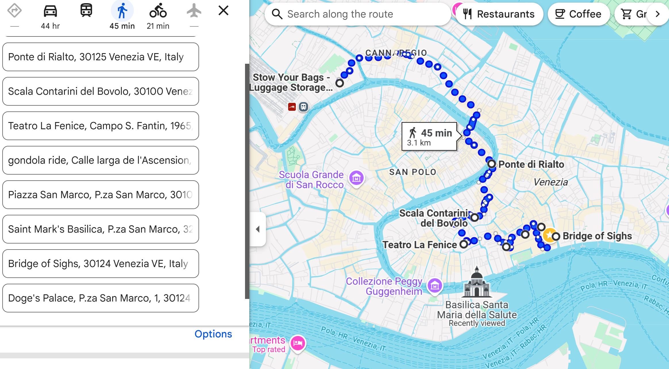 After our flight landed at Venice Marco Polo Airport in the morning, we took a taxi to Venezia Santa Lucia, the main train station in Venice. We stored our luggage at Stow Your Bags – Luggage Storage, conveniently located just a short walk from the station, and then set off for a full day of exploration. Here is our walking tour map. Then we wandered through the winding alleys, crossed charming little bridges, and soaked in the magical atmosphere of Venice from the very first step.
